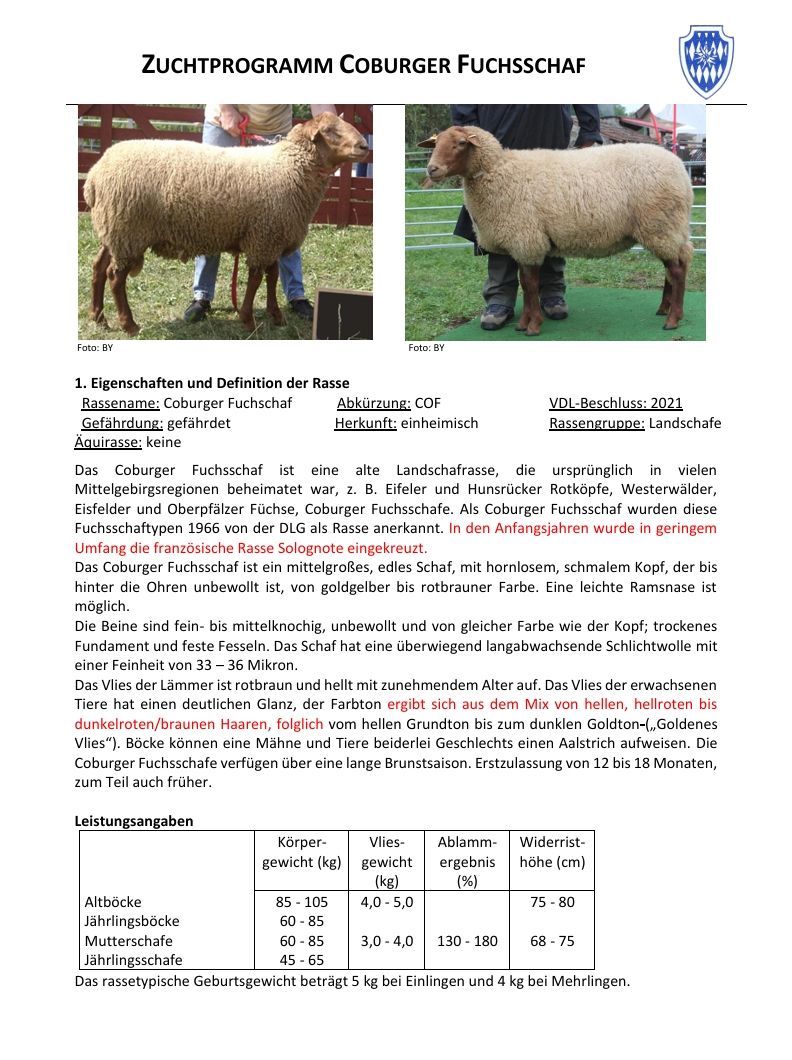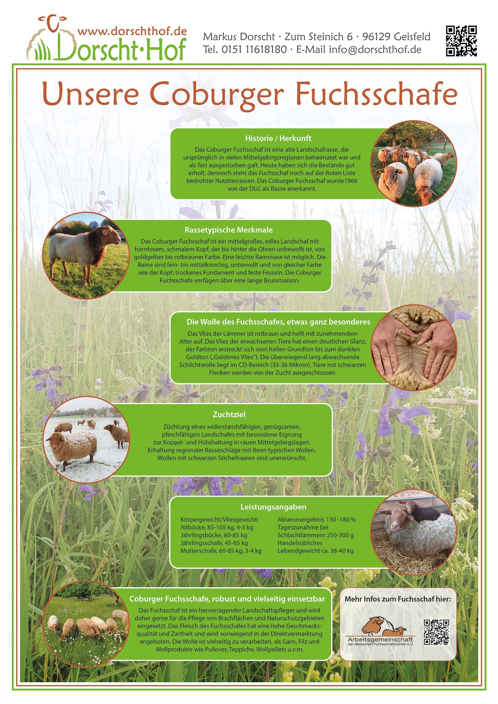 Das Coburger Fuchsschaf ist eine alte Landschafrasse, die ursprünglich in vielen Mittelgebirgsregionen beheimatet war und als fast ausgestorben galt. Heute haben sich die Bestände gut erholt, dennoch steht das Fuchsschaf noch auf der Roten Liste bedrohter Nutztierrassen. Das Coburger Fuchsschaf wurde 1966 von der DLG als Rasse anerkannt.